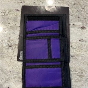 Bold purple wallet with Vikings logo. Black trim adds contrast. Official NFL merchandise.