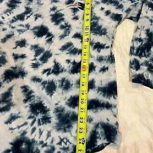 This shirt is bright white with blue tie dye, it is in very good condition with no signs of fading or wear. It is a slouchy type cut.