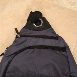 One strap. Like new. 4 zippered compartments.