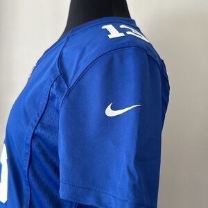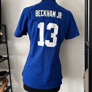 this is a blue jersey with white details. it is a v neck. it is more of a fitted jersey. Beckman Jr #13 New York Giants