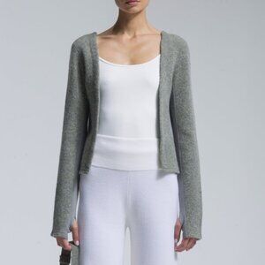 Convertible cardigan opens towards front or back, detachable straps form belt at waist if desired.