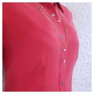 Beautiful & bright coral color short sleeve silk blouse is accented with mother-of-pearl buttons and has just a bit of spandex for an extra comfortable, slightly tailored fit.