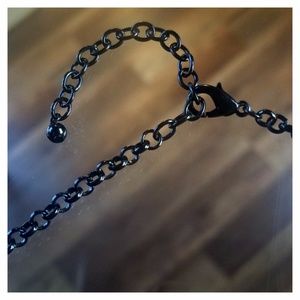 Stunning black chain choker with various size dangling teardrop beads and a 4" center drop with more faceted teardrop beads hanging from a 9 mm rhinestone studded ball.