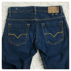 Regular slim fit with a boot cut leg, five pocket styling and a button fly.