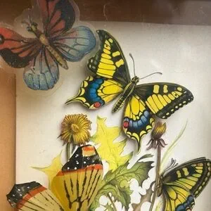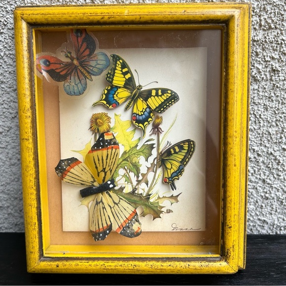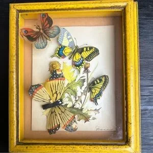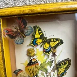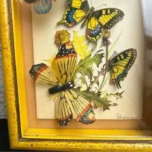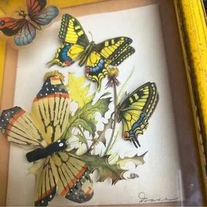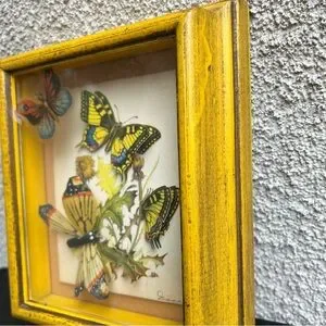 Beautiful framed butterfly art with vibrant colors. Features a striking yellow frame.