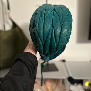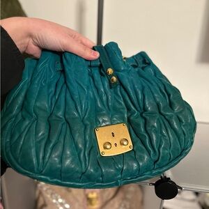 This is an authentic MIU MIU Nappa Matelasse Shoulder Bag in Teal. This stylish shoulder bag is crafted of soft Nappa leather in deep green/blue. The bag features a looping rolled leather side to side shoulder strap with large gold hoop links and an optional cross body strap with brass clasps with a cross over flap that closes with a gold press lock. This opens to a brown fabric interior with room for day or evening essentials with the stylish sophistication of Miu Miu!
