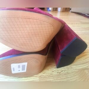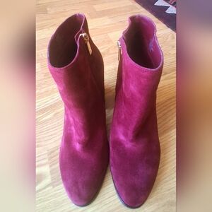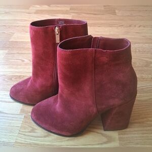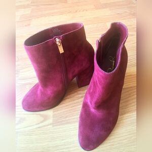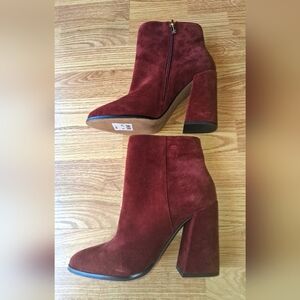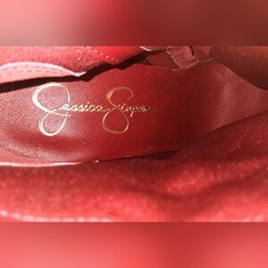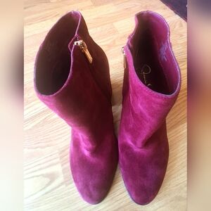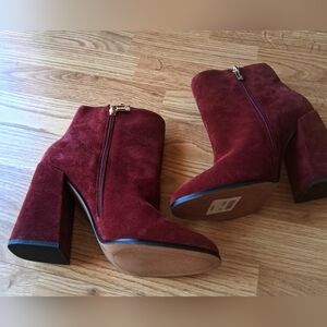 brand new Jessica Simpson, Burdened leather, suede, burgandy heels. zip zip. super sleek, sharp, stylish short style boots. get these fast!