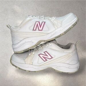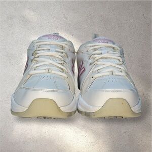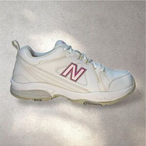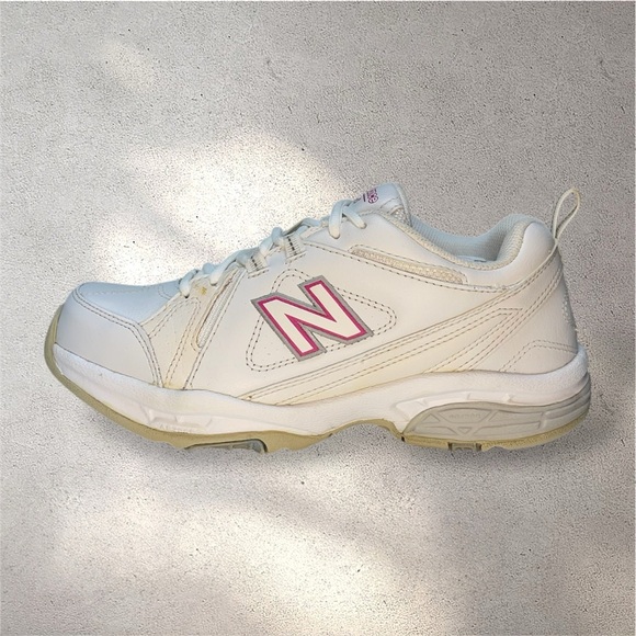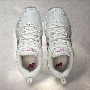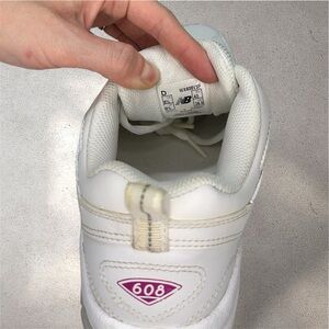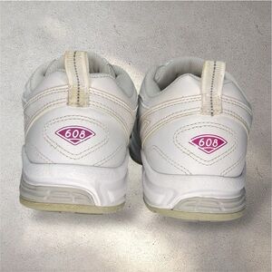 New Balance 608 v3 walking / training shoes in white with pink accents.