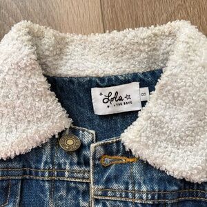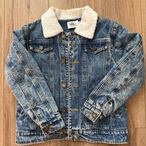 Trendy denim jacket with striking red snake design. Adds flair to any look.