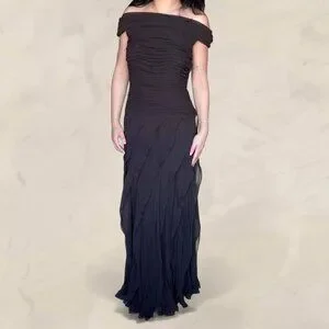 Tadashi Shoji silk chiffon flutter maxi dress evening gown off shoulder formal