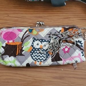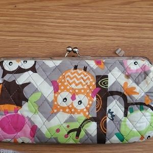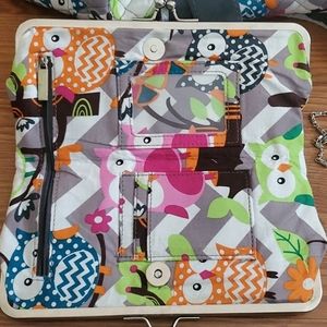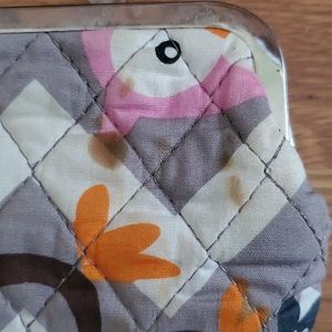 Wallet has stain on back side. Shown in pictures. Includes snap side of a coin section. Snap section includes coin slot, id slot, 3 card slots. Snap side includes, 8 card slots and money section. Has been used.I have not tried cleaning it the stain.
