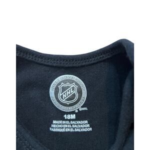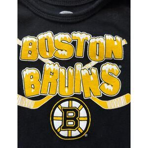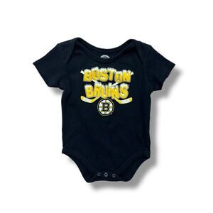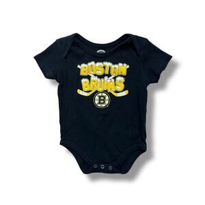 NHL brand Boston Bruins bodysuit in size 18 months. Short sleeves, lap neck, snaps at legs. 100% cotton. In very good pre-loved condition.