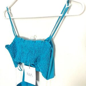 Turquoise cotton dress with side cutouts, ruched elastic back. New with tags.