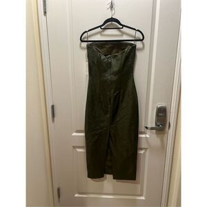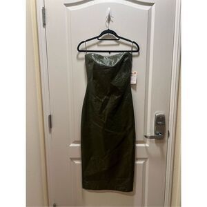 NIA Muna Vegan leather strapless body-con midi dress olive Green Cocktail Party size S NWT