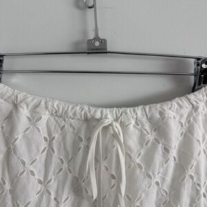 Cotton eyelet bias cut knee-length skirt with adjustable bowtie.