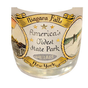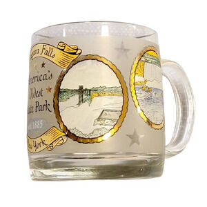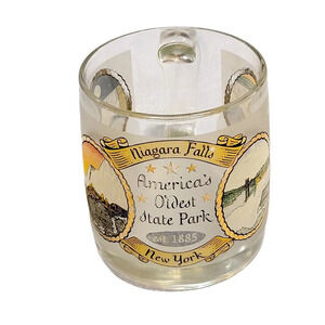 This is a beautifully decorated glass mug with four portrait pictures of scenes from Niagara Falls, America's Oldest State Park.