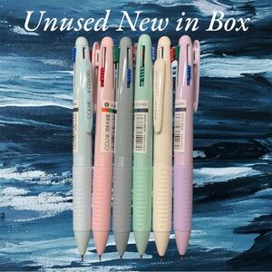 New in box. Never used. 6 Ballpoint fine tip pens 0.5mm. Each pen has 4 colors: black, red, black, and green.