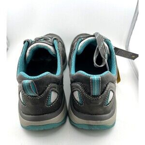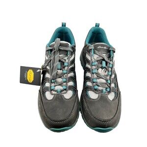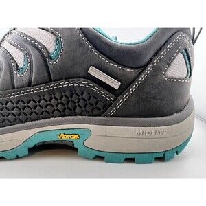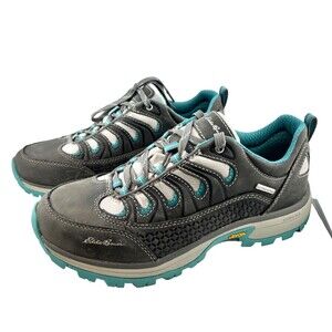 New in Box! Retail price $165! Women's hiking boots by Eddie Bauer called the Guide Pro Hiker, in color Gray, which is grey with teal blue trim. Features waterproofing and Vibram soles.