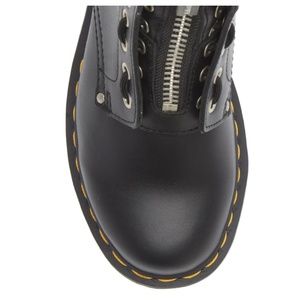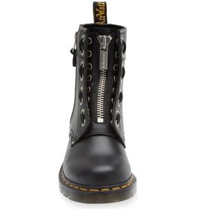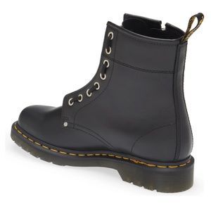 Brushed silvertone hardware lends a moto-inspired vibe to this classic 1460 boot highlighted with a removable front zipper panel.