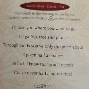 New in box, 1994 Hallmark Rocking Horse collectors series. Horse still has the plastic underneath and is wrapped in Hallmark tissue paper.