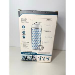 Set of 2 NEW in box BlenderBottle SportMixer shaker bottles in blue and gray. Includes one 28 oz bottle and one 20 oz bottle, each with its own stainless steel BlenderBall whisk for smooth shakes and mixes.