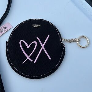 New with tags Victoria’s Secret bag and coin or key chain black and pink with gold hardware. Large bag is 8” by 11” and round bag is 5 1/2” by 6”.