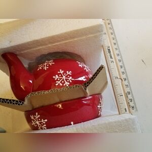 NIB 3 Pc Set Harry & David Snowdays Tea For One Lid Teapot Cup Red