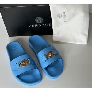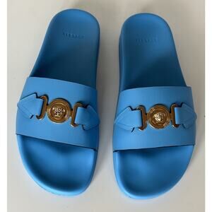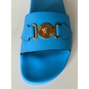 NIB $575 Versace Gold Medusa Leather/Rubber Sandals Blue 8.5 (41.5) 1004983 IT