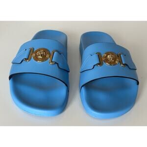 NIB $575 Versace Gold Medusa Leather/Rubber Sandals Blue 9.5 (42.5) 1004983 IT
