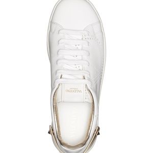A statement-scale V-logo emerges from the foil-backed perforations marking a crisp white court sneaker accented with rockstud detailing at the heel.