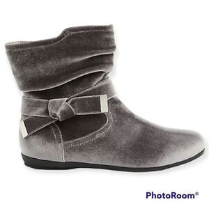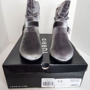NIB 7.5W Torrid Women Grey Velvet Bow Ankle Bootie Extra Wide Width Side Zip flat almond toe. NIB Torrid. Measurement photos for reference only approximately. 17×13×6 Wt 3lb 2oz