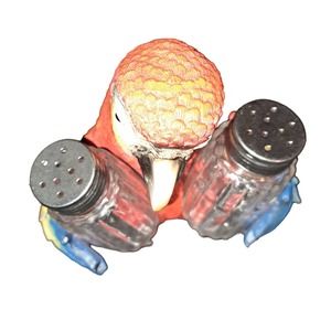 NEW No Tags - Colorful Scarlet Macaw Parrot Salt and Pepper Shaker Holder measures 6" Tall, 4" Long - 4" Deep. It weighs about 1 pound. The Parrot Salt & Pepper Shaker Holder is made of cold cast resin, hand painted and polished individually. Made to last FOREVER and Resilient to all elements.
