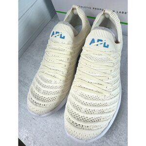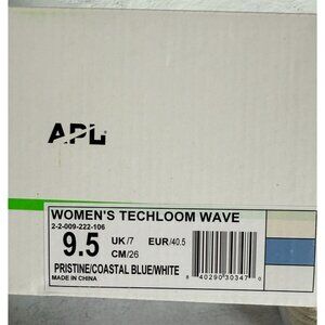 Performance design is at the forefront of the TechLoom Wave sneaker from APL. Featuring a newly developed, high-elastic 3D stretch rebound TechLoom upper that dynamically moves with your feet. They're designed to allow an increased stretch front-to-back where your feet articulate, while also providing lateral and medial support. An internal cage provides additional support and customizable lockdown when pulling the laces tight. Colors Pristine/Coastal Blue/White which is a Cream Ivory Vanilla, blue lettering and white soles. Women's size 9.5