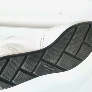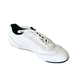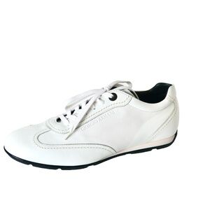This product is a pair of NIB Giorgio Armani men's leather sneakers in size US 6.5, EU 39.5, made in Italy. The sneakers are in a classic white color and feature an athletic style, perfect for casual or sporty looks. Crafted with high-quality leather, these sneakers are a stylish and durable addition to any man's footwear collection.
