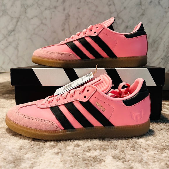 Brand new Adidas Samba Messi sneakers in pink with black stripes and gum sole. Gold MESSI lettering and heel logo. Never worn. Comes with box and original tags. Rare colorway.