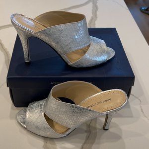 NIB Adrienne Vittadini Gunn Silver Snakeskin Sandals/Mules in Size 8 1/2. Stylish mules in metallic silver embossed snake print. These are new, never worn, they have been in my closet and I noticed that the glue spill over around the lining has turned from clear to brown over time, but this is not noticeable when worn. Heels are approximately 3 1/2 ". They run true to size.