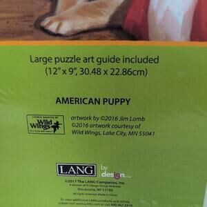 Perfect for dog lovers, this puzzle showcases vibrant colors and detailed artwork by Jim Lamb. The artwork features three adorable labrador retriever puppies with an American flag curled around them. The puzzle is linen embossed with precision cut pieces. Puzzle guide included.