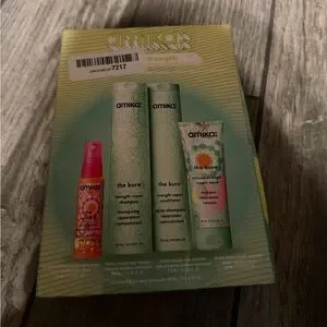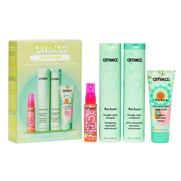 NIB Amika Inner Strength Repair Routine Set | Gift Set For Dry, Damaged Hair From Bleach, Color, Chemical, Or Heat Use. Tap into your strongest, most protected strands with this bond-fortifying set featuring full-sizes of the kure strength repair shampoo + conditioner, plus travel-sizes of the kure intense strength repair mask + the wizard silicone-free detangling primer.