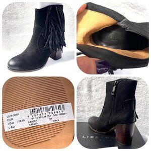 $356 Retail Amazing quality and comfort! New in Box Anthropologie Liebeskind Berlin Suede Fringe Nubuck Black Chunky Ankle Boots 7. Suede upper, leather lining and sole. Round-toe ankle boots with tonal stitching, stacked block heels, fringe details and zip closure at sides. Includes box.