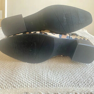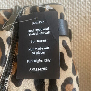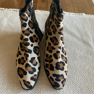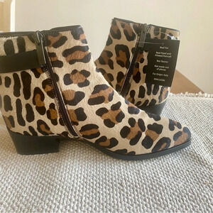 NIB Weatherproof leopard calf hair ankle boot with black strap, Side zipper for easy on/off, Stacked heel 1”