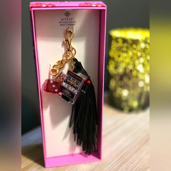 Add a playful, luxe touch to your favorite bag with this stylish Atterri bag charm. Features charms with intricate detailing, glittery dice, and a bold black leather tassel. Gold-tone hardware and sturdy clasp make it easy to attach to handbags, backpacks, or luggage.