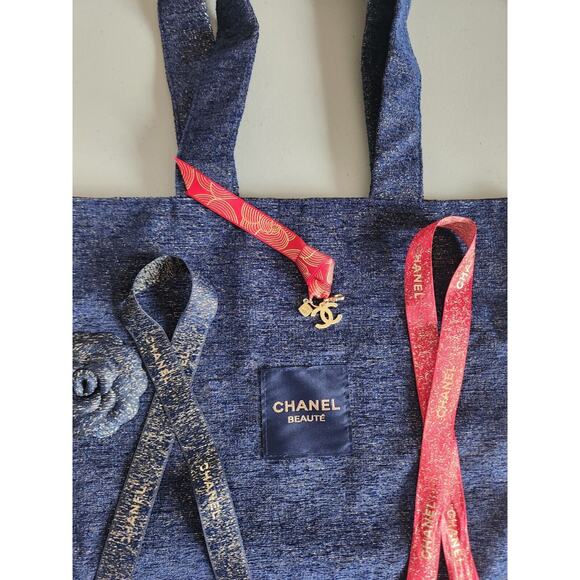NIB Auth Chanel Beaute VIP Gift Blue Shopper Tote Bag Ribbon Charm Flower