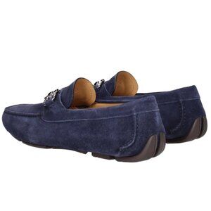 Elevate your style with these brand new, authentic Salvatore Ferragamo PARIGI ECO Men's Suede Loafers in a sophisticated Blue Marini (Navy). Crafted in Italy from smooth calfskin suede, these timeless driver-style loafers feature a refined moc toe, signature Gancini bit hardware, and a supple leather lining for all-day comfort.