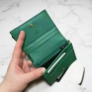 This is an authentic GUCCI Pebbled Calfskin Fiori Floral Embroidered Ricamo Card Case in Green. This stylish card holder is crafted of textured calfskin leather in green with a multicolored stitched floral design. The flap features a gold interlocked GG logo with red crystals and opens to a matching leather interior with card slots and a small zipper compartment. This is a wonderful card case for everyday conveniences, from Gucci!
