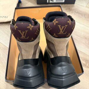 The most striking feature lies in the thick, voluminous soles—between the footbed and heel, they are adorned with exaggerated, wavy lateral moldings shaped like an arch. The upper is crafted from calf suede, and its design evokes LOUIS VUITTON’s iconic Laurate desert boot.