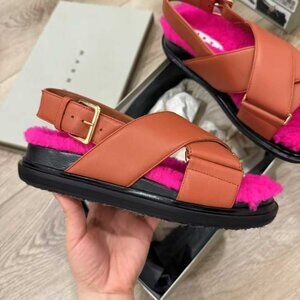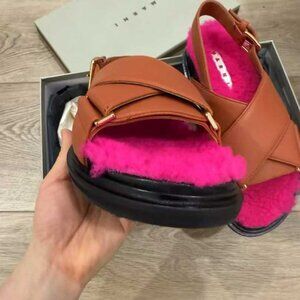 Step into luxurious comfort and avant-garde style with these stunning Marni flat sandals. Crafted from a chic combination of fuchsia pink lamb fur, rich brown leather, and a sleek black sole, these sandals are designed to make a statement.