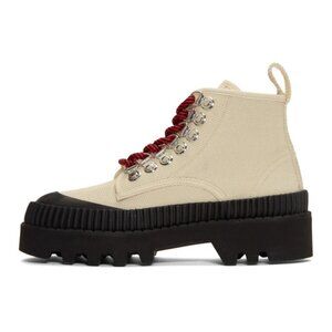 Ankle-high cotton canvas boots in off-white. Round rubber cap toe in black. Lace-up closure woven in red and black. Logo flag at collar. Tonal webbing pull-loop at heel. Vulcanized treaded rubber sole in black. Silver-tone hardware. Tonal stitching.
