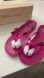 Glossy pink flip-flops with bow detail. Perfect for casual wear.