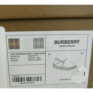 NIB BURBERRY BEACH DORWOOD COTTON CANVAS BRIGHT COBALT MULTI MONOGRAM PRINT LOGO ESPADRILLE FLATS