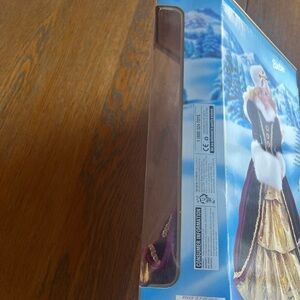 Celebrate the season with this elegant Barbie Happy Holidays Special Edition doll. She wears a luxurious burgundy and gold gown with white fur accents.